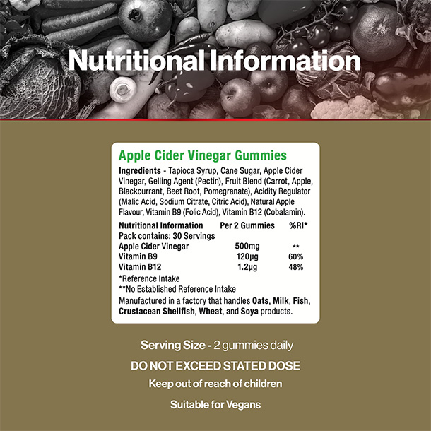 • Tapioca Syrup, Cane Sugar, Apple Cider Vinegar, Gelling Agent (Pectin), Fruit Blend (Carrot, Apple, Blackcurrant, Beet Root, Pomegranate), Acidity Regulator (Malic Acid, Sodium Citrate, Citric Acid), Natural Apple Flavour, Vitamin B9 (Folic Acid), Vitamin